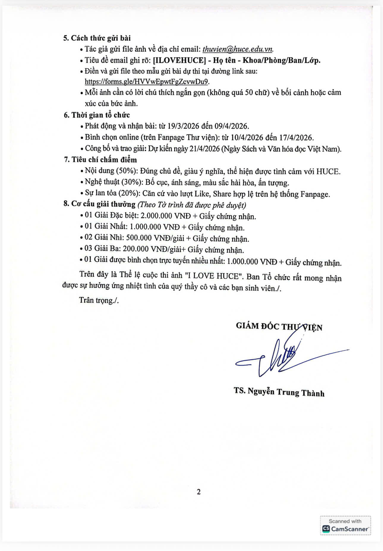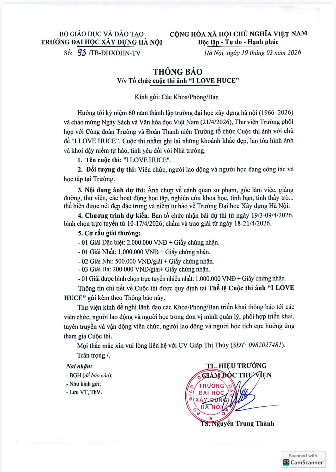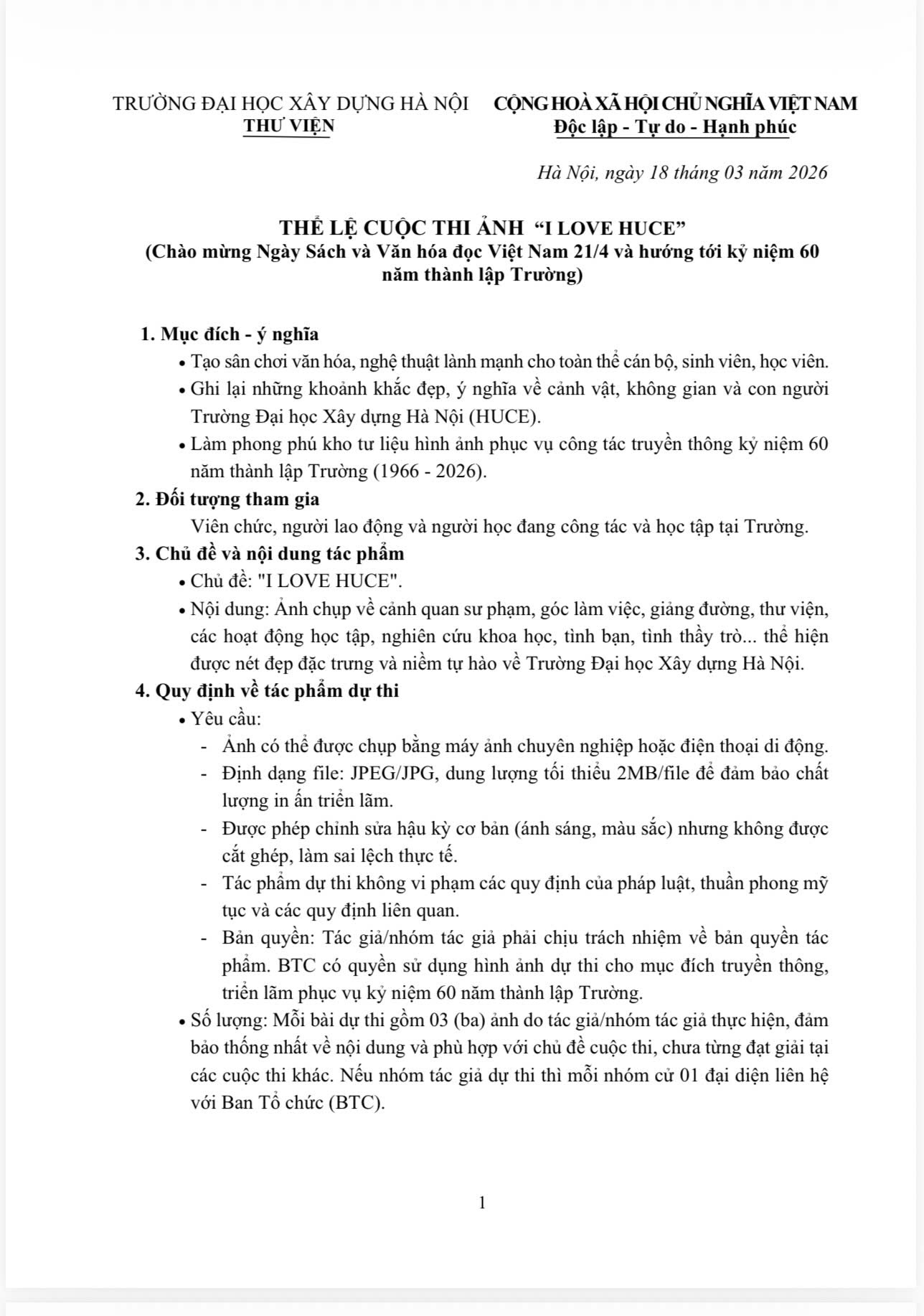 Hướng tới kỷ niệm 60 năm thành lập Trường Đại học Xây dựng Hà Nội (1966-2026) và thực hiện các hoạt động chào mừng Ngày Sách và Văn hóa đọc Việt Nam (21/4) lần thứ 5. Thư viện phối hợp cùng Công đoàn và Đoàn Thanh niên Trường tiến hành tổ chức cuộc thi ảnh với chủ đề "I LOVE HUCE".