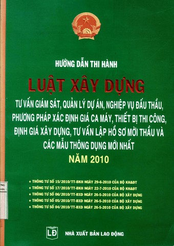 Hướng dẫn thi hành luật xây dựng tư vấn giám sát, quản lý dự án, nghiệp vụ đấu thầu, phương pháp xác định giá ca xe, thiết bị thi công, định giá xây dựng, tư vấn lập hồ sơ mời thầu và các mẫu thông dụng mới nhất năm 2010 : Thông tư số 15/2010/TT-BKH ngày 29-6-2010 của Bộ KH&ĐT, thông tư số 17/2010/TT-BKH ngày 22-7-2010 của Bộ KH&ĐT, thông tư số 06/2010/TT-BXD ngày 26-5-2010 của Bộ Xây dựng, thông tư số 05/2010/TT- BXD ngày 26-5-2010 của Bộ Xây dựng, thông tư số 04/2010/TT- BXD ngày 26-5-2010 của Bộ Xây dựng